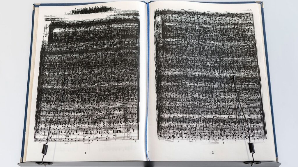 Il lavoro più complesso e strabiliante su questo tema è racchiuso nella mostra In Varietate Concordia realizzata nel 2022 presso il centro di ricerca Linea Project di Lecce, 2022. La locuzione latina che dà il titolo alla mostra coincide con il motto ufficiale dell’Unione, scelto per enfatizzare il multiculturalismo caratterizzante il progetto comunitario ma puntualmente contraddetto dall’ asincronia politica dei diversi stati. L’esposizione comprende diverse opere, di cui la più impressionante è uno spartito su cui sono stati sovrapposti i testi e gli spartiti degli inni degli stati membri dell’Unione Europea. Al pari di motti e bandiere, gli inni nazionali sono strumenti ideologici e demagogici, capaci di cementare musicalmente una comunità e divenire simbolo condiviso di appartenenza. Disciplinato giuridicamente e difeso dalla legge, l’inno è la traduzione in musica e poesia del progetto dello Stato moderno. Ha uno status diverso da qualsiasi altra melodia e va suonato con solennità e senza interferenze; da solo o, al più, prima di un inno straniero in segno di alleanza.
