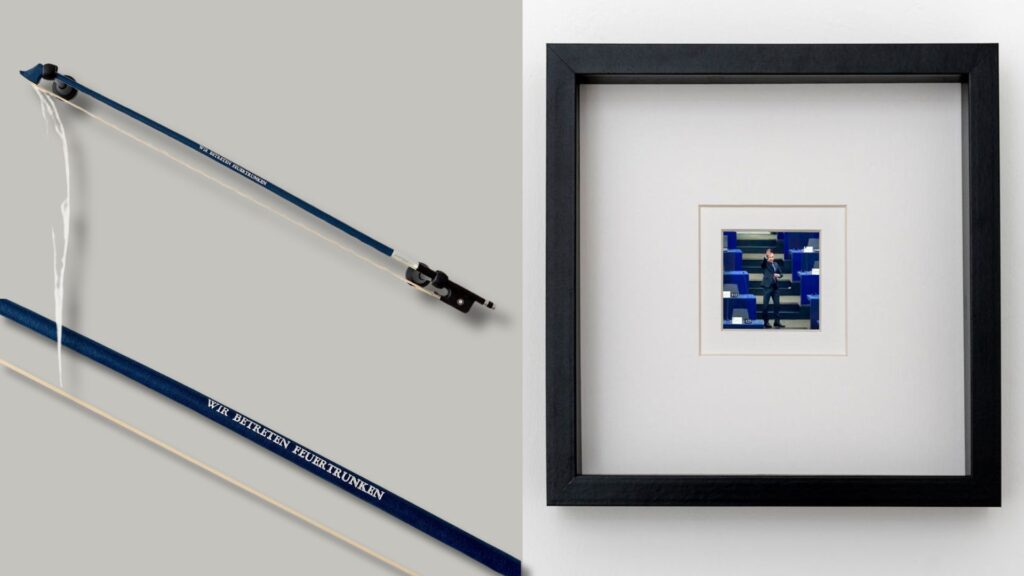 A completamento di questo ritratto sono dell’Europa, Guastamacchia realizza un archetto per violoncello il cui manico riporta l’espressione “wir betreten feuertrunken” tratta dall’ Inno alla gioia di Schiller che fu poi utilizzato da Beethoven nella Nona Sinfonia. Questo brano è l’inno ufficiale dell’Europa, però le parole di Schiller non hanno seguito lo stesso destino: il testo ultra-umanista, per qualche motivo, non fu ritenuto abbastanza universale. L’archetto con l’incisione “wir betreten feuertrunken” non è un’apologia del poema di Schiller, ma un focus su uno dei suoi primi versi, dove l’umanità è descritta “camminare ubriaca di fuoco” [verso il futuro]. L’arco è intatto ma logoro e la frase, a distanza di centinaia di anni, sembra essersi trasformata in un monito nemmeno tanto velato, se guardiamo all’ultimo pezzo di questa mostra: una fotografia del rappresentante bulgaro Angel Dzhambazki che conclude con un saluto romano il suo discorso in difesa dell’ “Europa delle nazioni” al Parlamento europeo nel 2022.