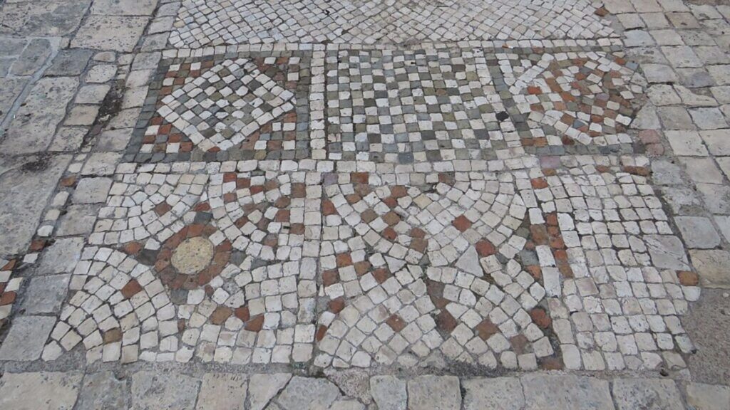 Nel corso del XII secolo l’edificio subisce un importante rifacimento: vengono introdotte colonne e capitelli di spoglio al posto dei pilastri originari, mentre il pavimento viene completamente rinnovato con blocchetti di calcare e marmo policromo, disposti in quattordici riquadri nella navata centrale, in un’elegante composizione di motivi vegetali e geometrici. Le sei colonne visibili oggi appartengono a questa fase, e i loro capitelli corinzi richiamano quelli conservati nel cortile del Castello Svevo, probabilmente provenienti dallo stesso ciclo decorativo.
